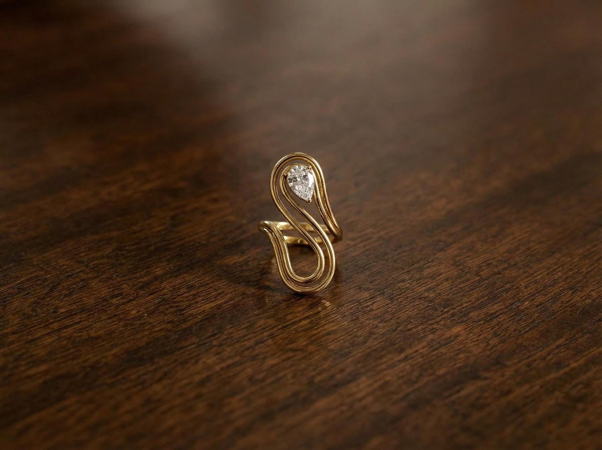 A striking S-shaped adjustable ring crafted in 925 sterling silver, finished with a shiny gold plating and a sparkling cubic zirconia stone.
